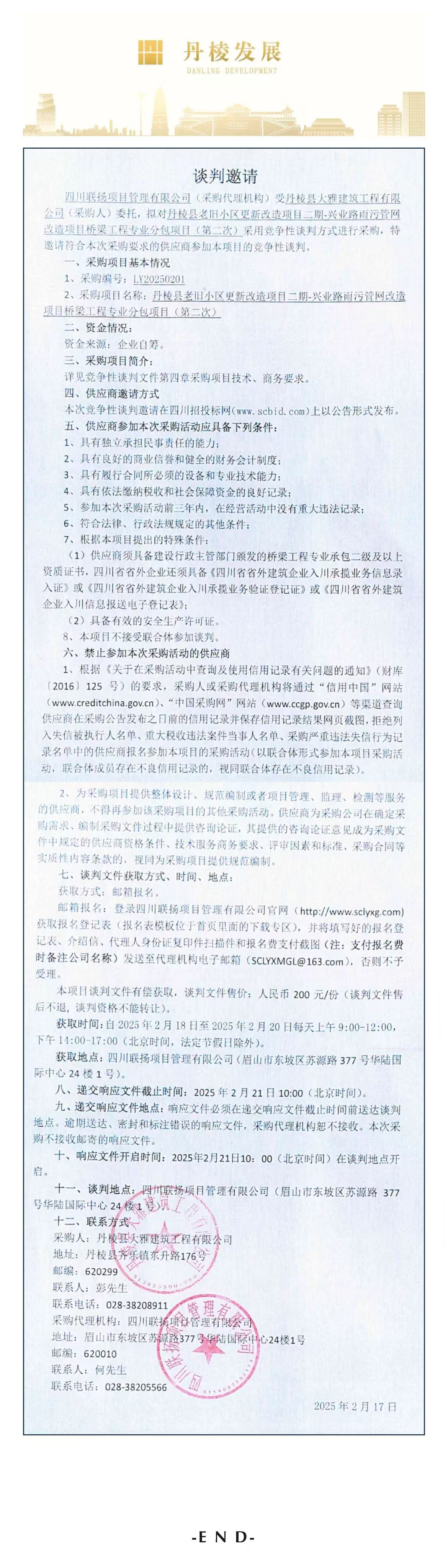 丹棱縣老舊小區(qū)更新改造項(xiàng)目二期-興業(yè)路雨污管網(wǎng)改造項(xiàng)目橋梁工程專(zhuān)業(yè)分包項(xiàng)目談判邀請(qǐng)公告(第二次)