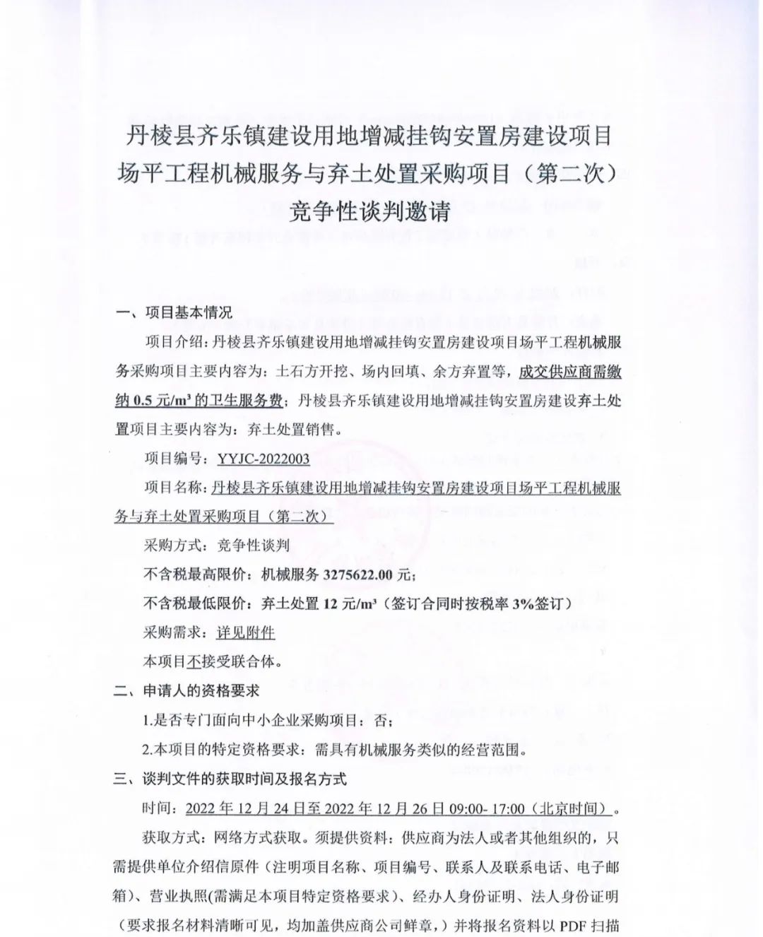 丹棱縣齊樂鎮(zhèn)建設(shè)用地增減掛鉤安置房建設(shè)項(xiàng)目場(chǎng)平工程機(jī)械服務(wù)與棄土處置采購(gòu)項(xiàng)目(第二次)競(jìng)爭(zhēng)性談判邀請(qǐng)