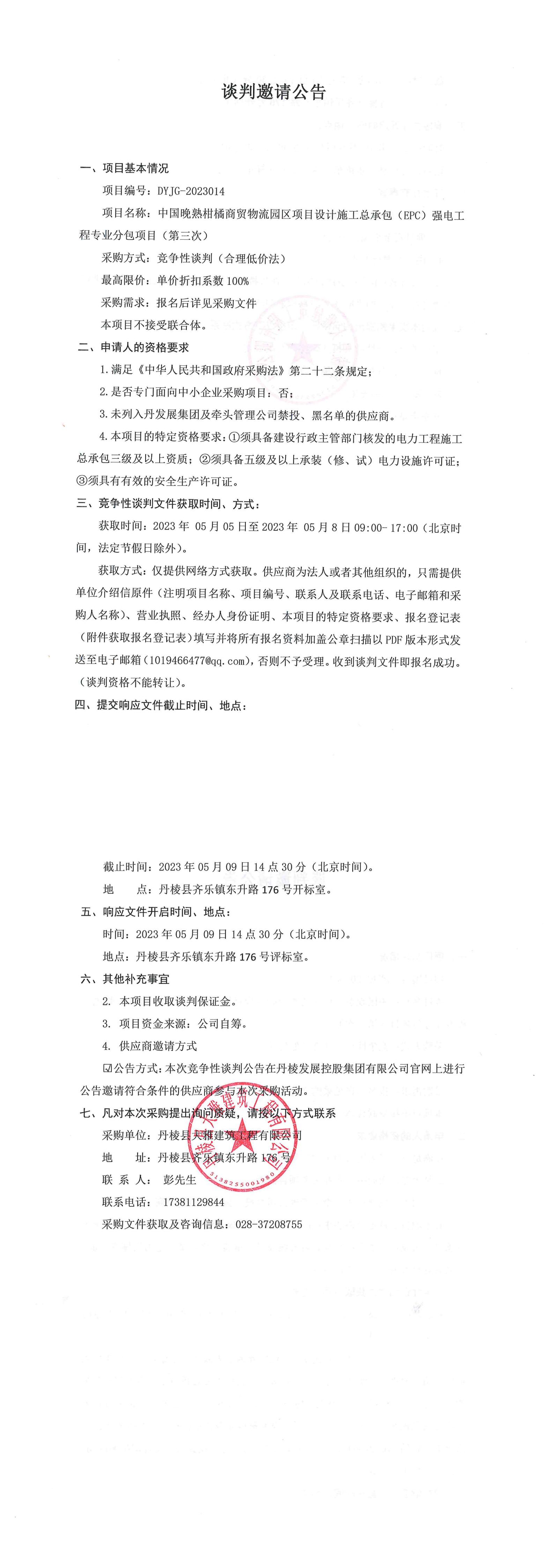 中國(guó)晚熟柑橘商貿(mào)物流園區(qū)項(xiàng)目設(shè)計(jì)施工總承包(EPC)強(qiáng)電工程專(zhuān)業(yè)分包項(xiàng)目(第三次)談判邀請(qǐng)公告