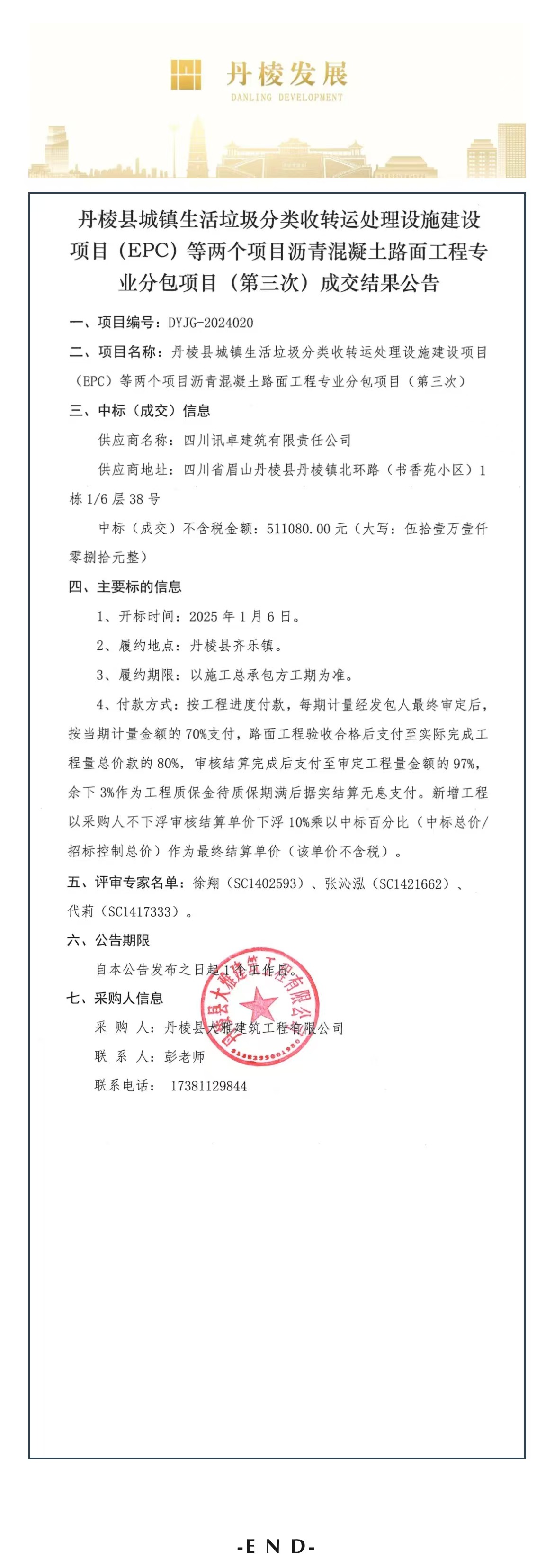 丹棱縣城鎮(zhèn)生活垃圾分類收轉運處理設施建設項目(EPC)等兩個項目瀝青混凝土路面工程專業(yè)分包項目(第三次)成交結果公告