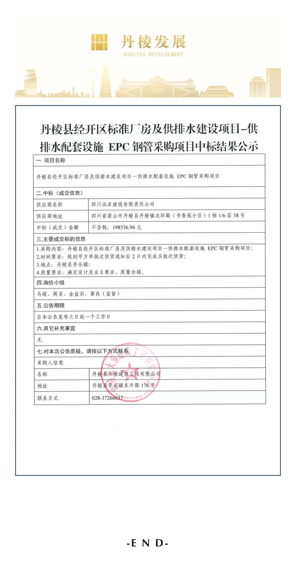 丹棱縣經(jīng)開區(qū)標(biāo)準(zhǔn)廠房及供排水建設(shè)項(xiàng)目——供排水配套設(shè)施EPC鋼管采購(gòu)項(xiàng)目中標(biāo)結(jié)果公示