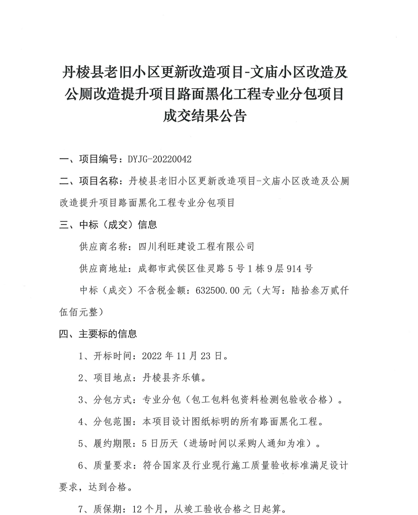 丹棱縣老舊小區(qū)更新改造項目-文廟小區(qū)改造及公廁改造提升項目路面黑化工程專業(yè)分包項目成交結(jié)果公告